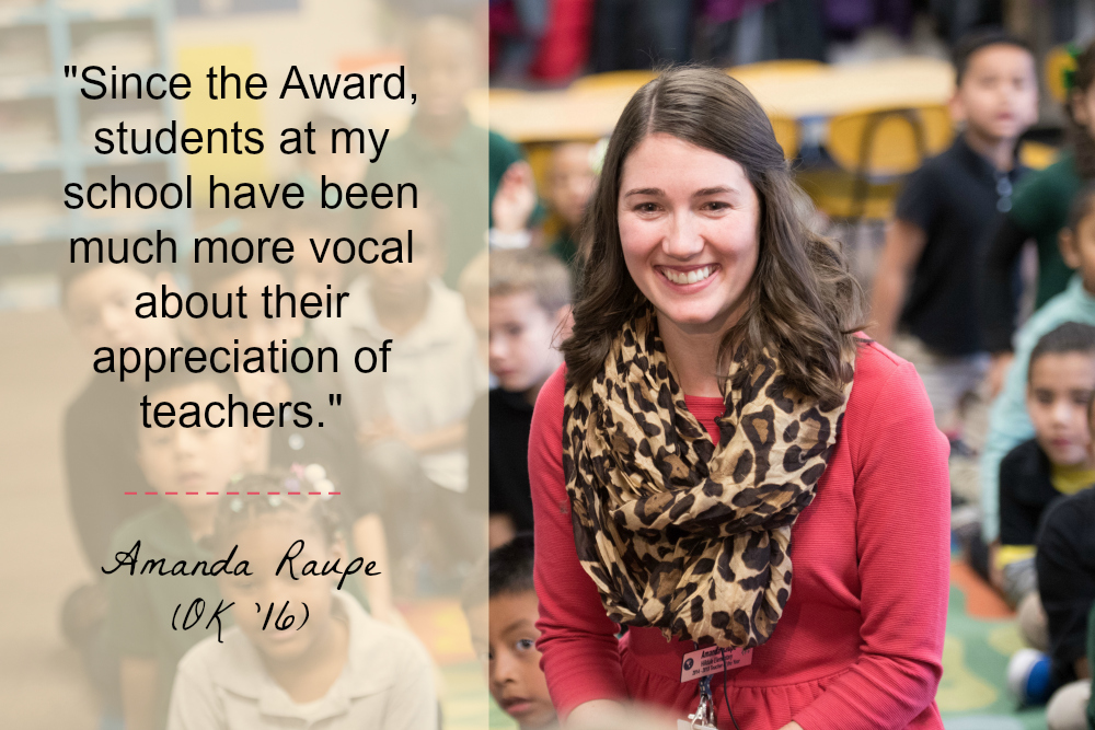 Amanda: Since the Award, students at my school have been much more vocal about their appreciation of teachers. Students from past years and students I never personally had in class constantly come up to me to say congratulations and that I deserve it. I've also had several students tell me that they want to be a teacher, just like me, when they grow up. It brings tears to my eyes every single time.