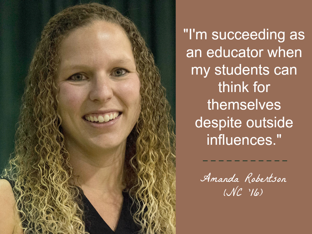 Amanda Robertson: I started thinking about becoming a teacher in the fifth grade. I was ambitious: I wanted to be a writer, artist, teacher or doctor. My high school was divided into career paths based on what you wanted to study in college. I wanted to be a pediatrician, so I went down the path for health and human services.