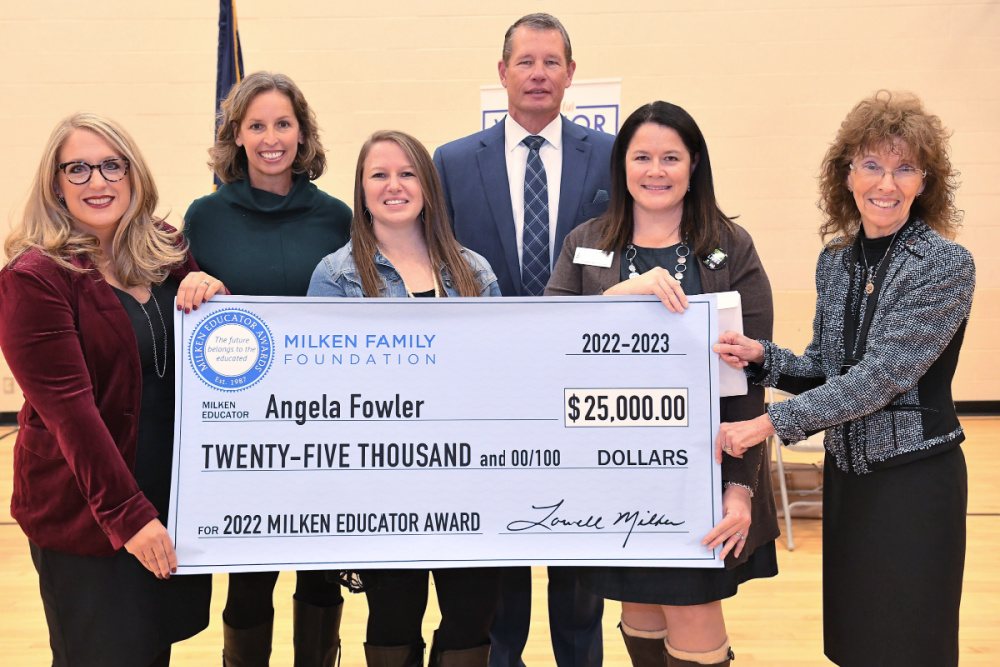 After her surprise Milken Educator Award assembly, math teacher Angela Fowler (IN ’22) told her fourth graders that the Award will have a direct impact on their education: “I get to be part of a life-changing organization full of other passionate teachers.” Angela received Indiana’s 2022-23 Milken Award at Grassy Creek Elementary in Greenwood on November 22, 2022.
