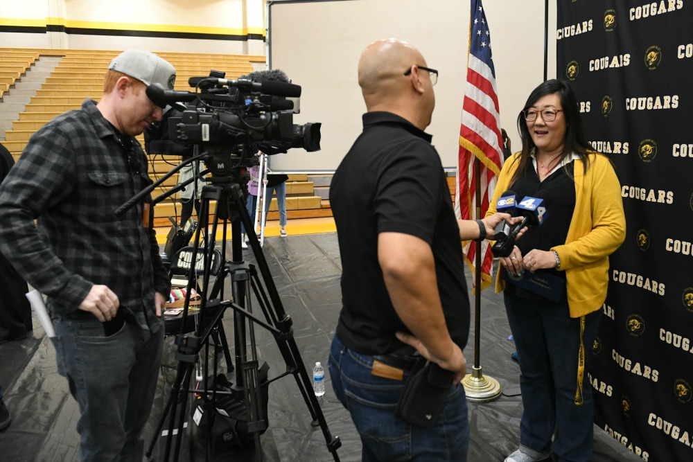 Candice: There was very little information given about the assembly so we all (the faculty and students) kind of just showed up without much expectation. I told the students on my newspaper staff to cover the story. I wasn’t entirely sure what would happen so I put a lot of photographers on the floor and even took a camera myself so I could try to get some shots in. I was concerned about making sure my kids were allowed on the floor to shoot the event.