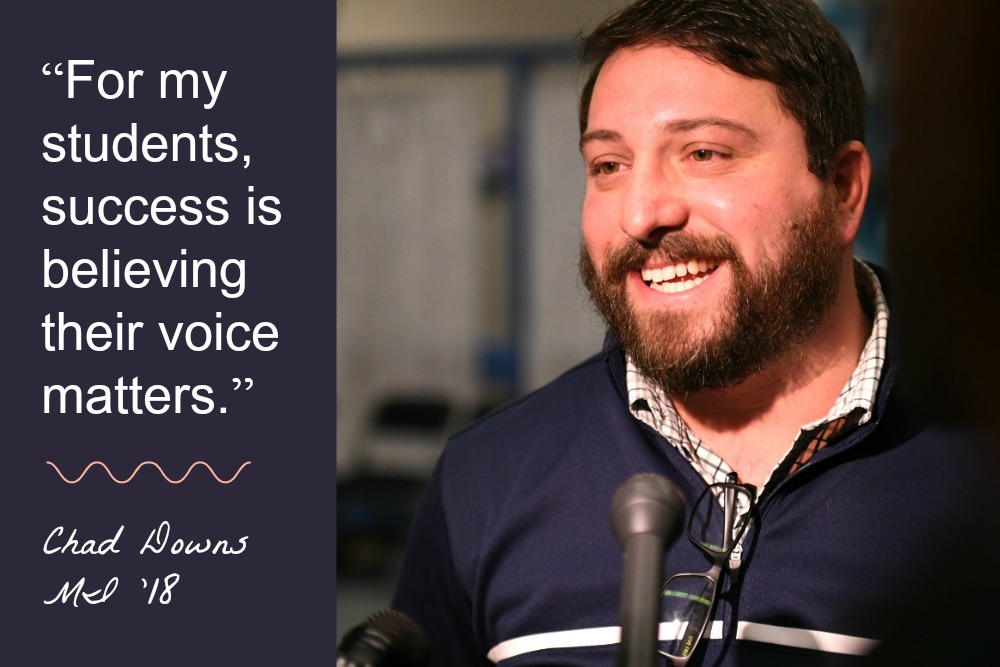 Chad Downs (MI ’18) is passing the torch to the next generation: His new Future of Education Scholarship, funded by his Milken Educator Award prize, goes to a high school senior in his hometown who plans to teach. Chad won Michigan’s 2018-19 Award at Ann Arbor Open School on December 12, 2018.