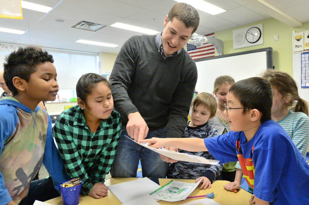 First- and second-grade teacher Paul Campbell (AK '16) loves the way his young students reflect whatever he's feeling or is excited about: "It's a huge reminder for me each day to model a genuine love for learning new things." Campbell received Alaska's 2016-17 Milken Educator Award at Chester Valley Elementary in Anchorage on November 22, 2016.