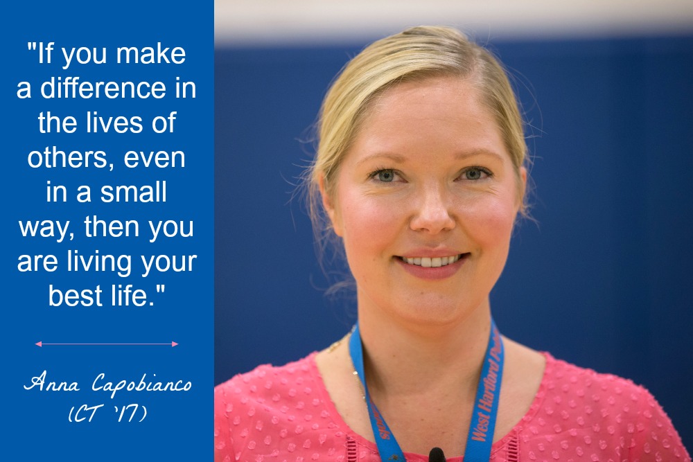 Anna Capobianco (CT ’17) considers meeting the diverse learning needs of all students both a challenge and a necessity: “It can feel Herculean at times, but it is the most important thing teachers can do for their students.” The English teacher won Connecticut’s 2017-18 Milken Award at Hall High School in West Hartford on October 24, 2017.
