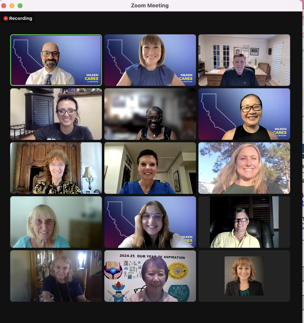 California Miken Educators connected virtually during the August Milken CARES Virtual MeetUp that highlighted the theme of New Beginnings to kick off the school year. Each meeting integrates a Celebrate, Elevate, and Activate component aligned to the purpose of the Milken Educator Awards.