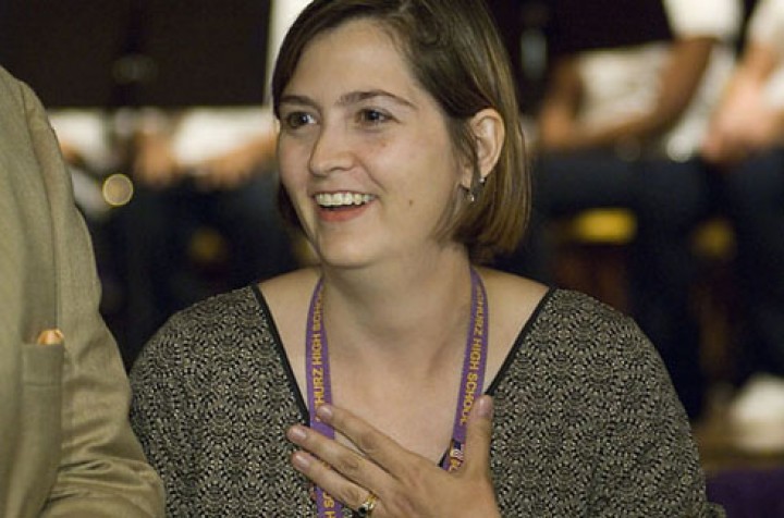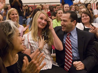 Samantha Godden-Chmielowicz (IL '07) catches her breath after being surprised with a $25,000 Milken Educator Award.