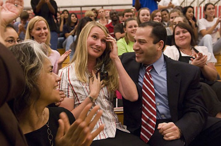 Cindi Carroll (TX '07) is surprised with a $25,000 Milken Educator Award amid the thundering applause of students and colleagues, including veteran Milken Educator Jonathan Harris (TX '03) sitting beside her.