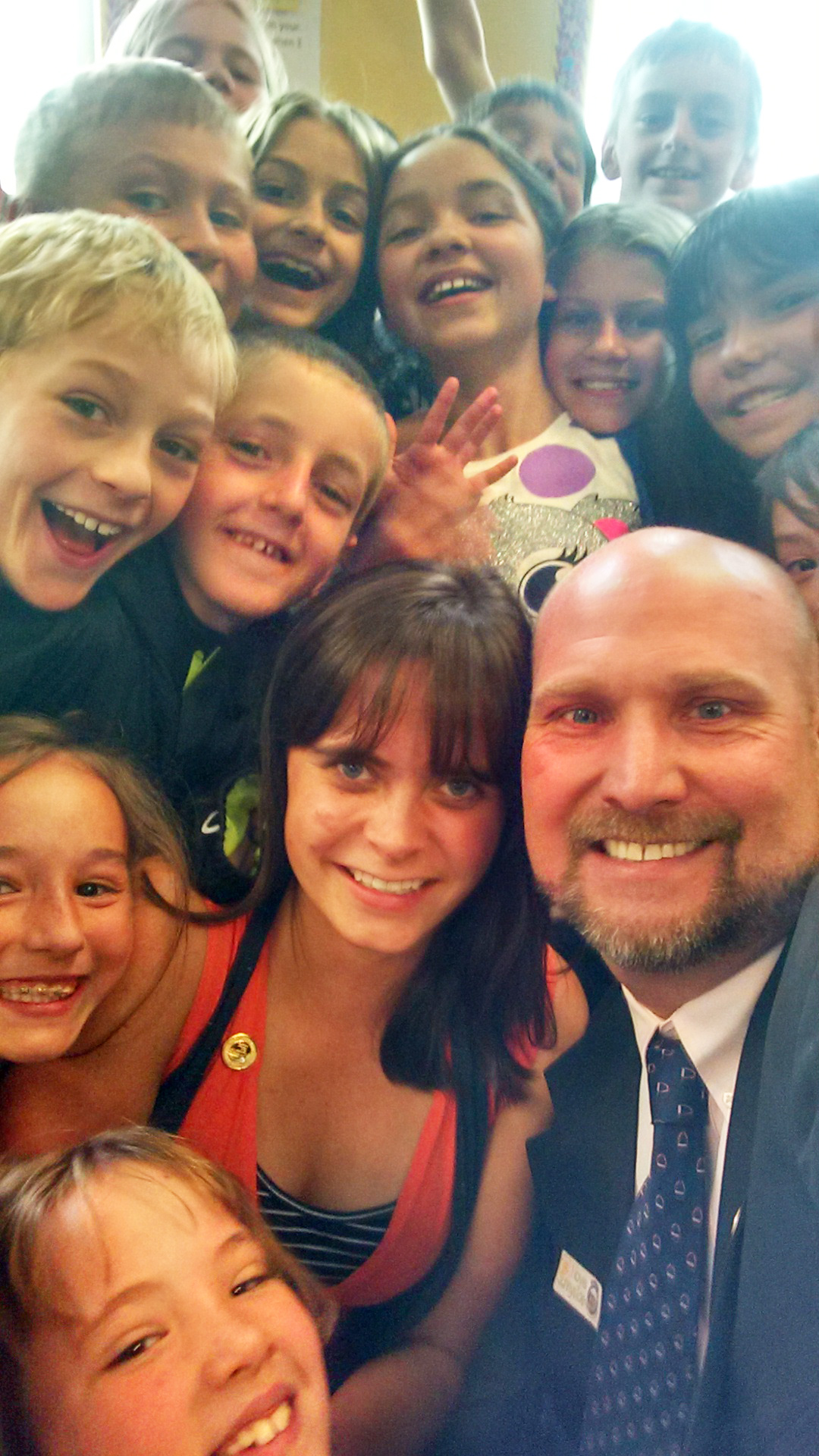 Nationwide | May 04, 2015Carrie Harper (CO '14), a third-grade teacher at Sunnyside Elementary School in Durango, Colorado, displays her Milken pin as she poses with her students and veteran Milken Educator Alex Carter (VA '03).