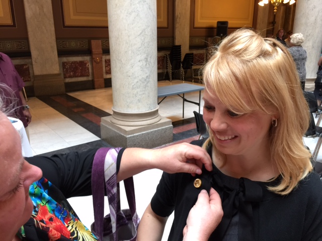 Nationwide | May 04, 2015Veteran Milken Educator Janet Pernell (IN '05) surprised new recipient Kelly Wilber (IN '14) with her Milken pin at the Indiana State House.