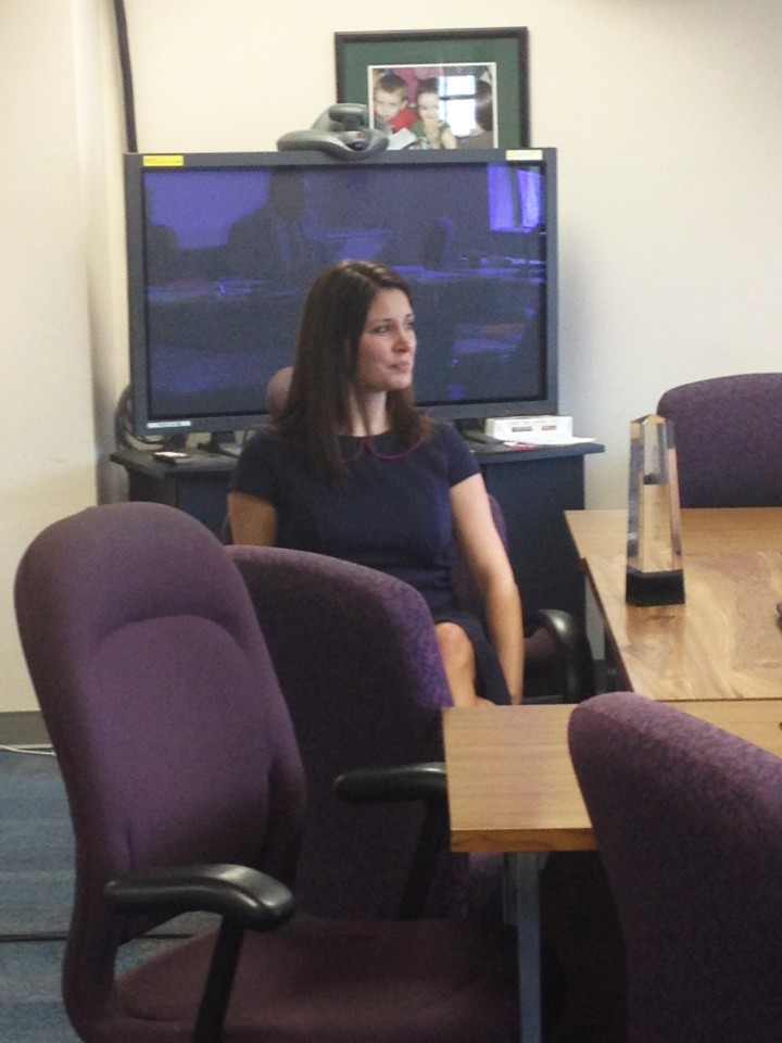 Nationwide | 2014–15First-grade teacher Julie Wojcicki-Cleave (OR '14) from Hallman Elementary School in Salem, Oregon sits with her Milken Educator obelisk during a presentation in her honor at an Oregon Department of Education State Board meeting on Jan. 22, 2015.