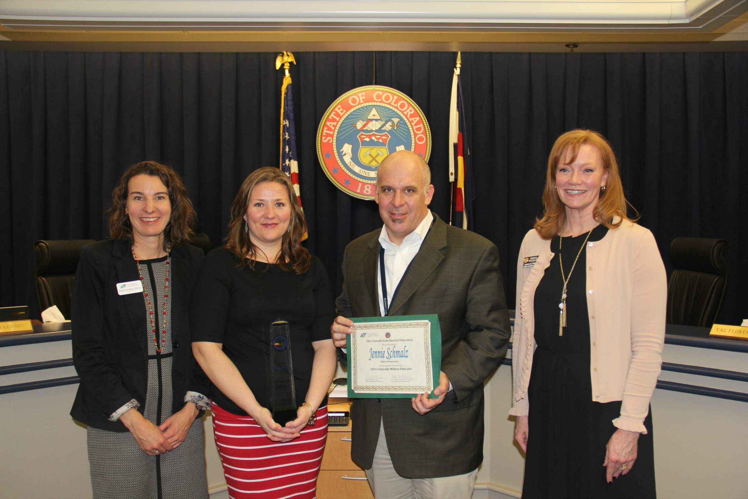 From left, Colorado Commissioner of Education Dr. Katy Anthes; Milken Educator Jennie Schmaltz (CO '16); Elkhart Elementary Principal Ron Schumacher; and Colorado State Board of Education Member Rebecca McClellan.