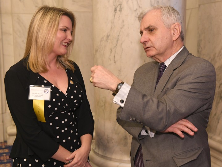 Rhode Island Milken Educator Lauren Hopkins (RI '17) and U.S. Senator Jack Reed discuss important issues in education at the 2018 Milken Educator Awards Forum in Washington, D.C.