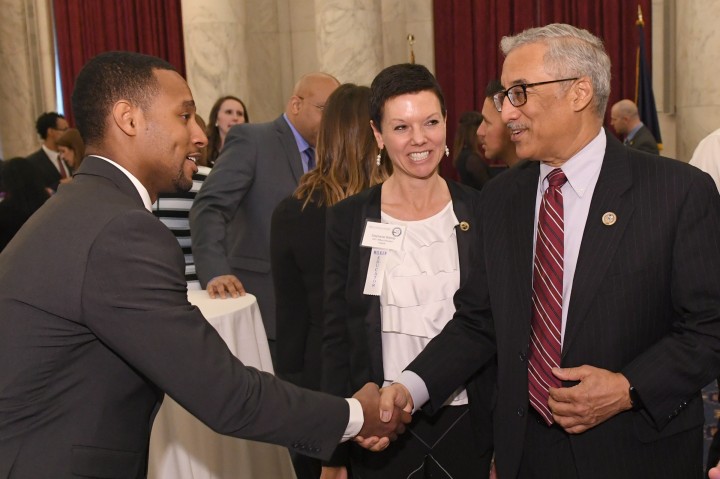 Virginia Milken Educators Ryan James (VA '17) and Stephanie Bishop (VA '01) discuss important issues in education with U.S. Representative Bobby Scott at the 2018 Milken Educator Awards Forum in Washington, D.C.