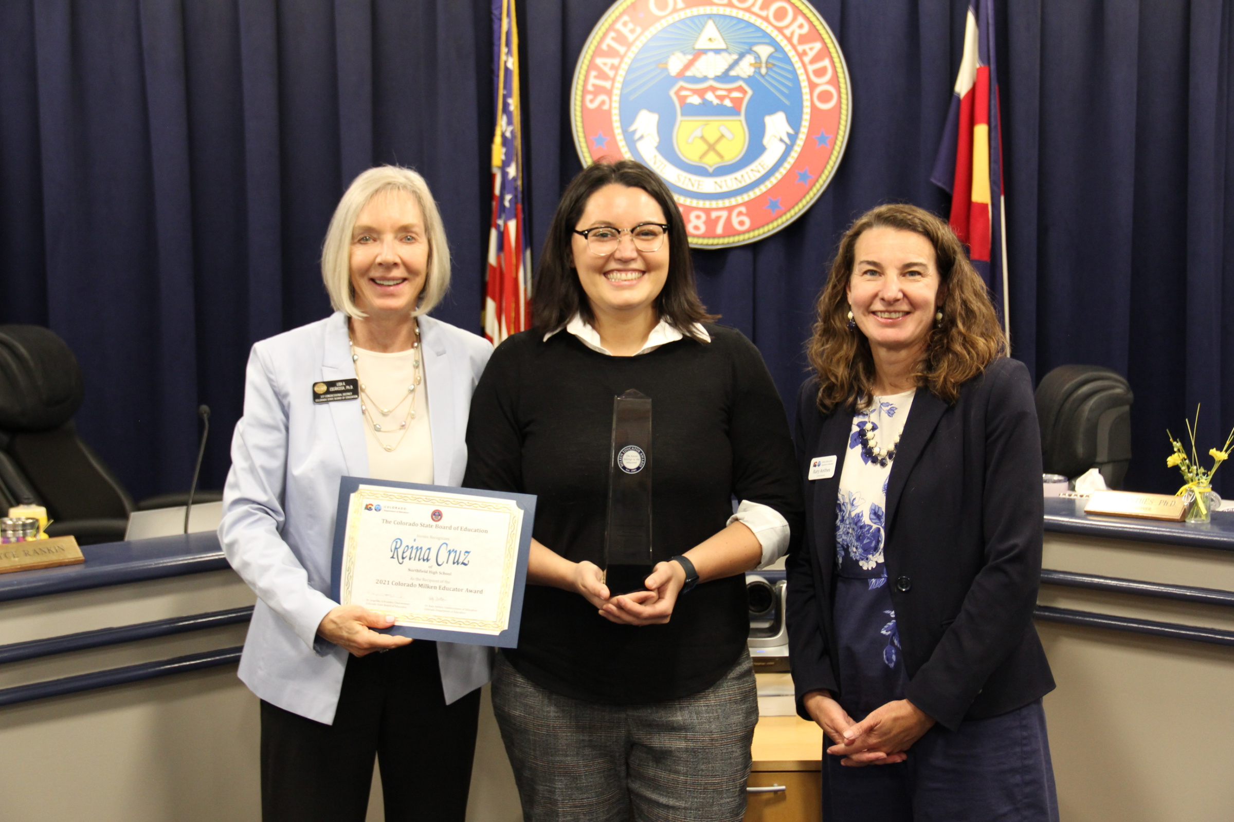From left, Dr. Lisa Escárcega, member of the Colorado State Board of Education; recipient Reina Cruz; and Colorado Commissioner of Education Dr. Katy Anthes.