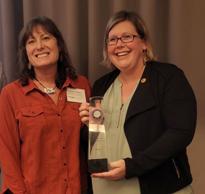 Jun 01, 2022Jamie Karaffa (ME '21) receives her Milken Award obelisk from Maine Commissioner of Education and fellow Milken Educator Pender Makin (ME '01).