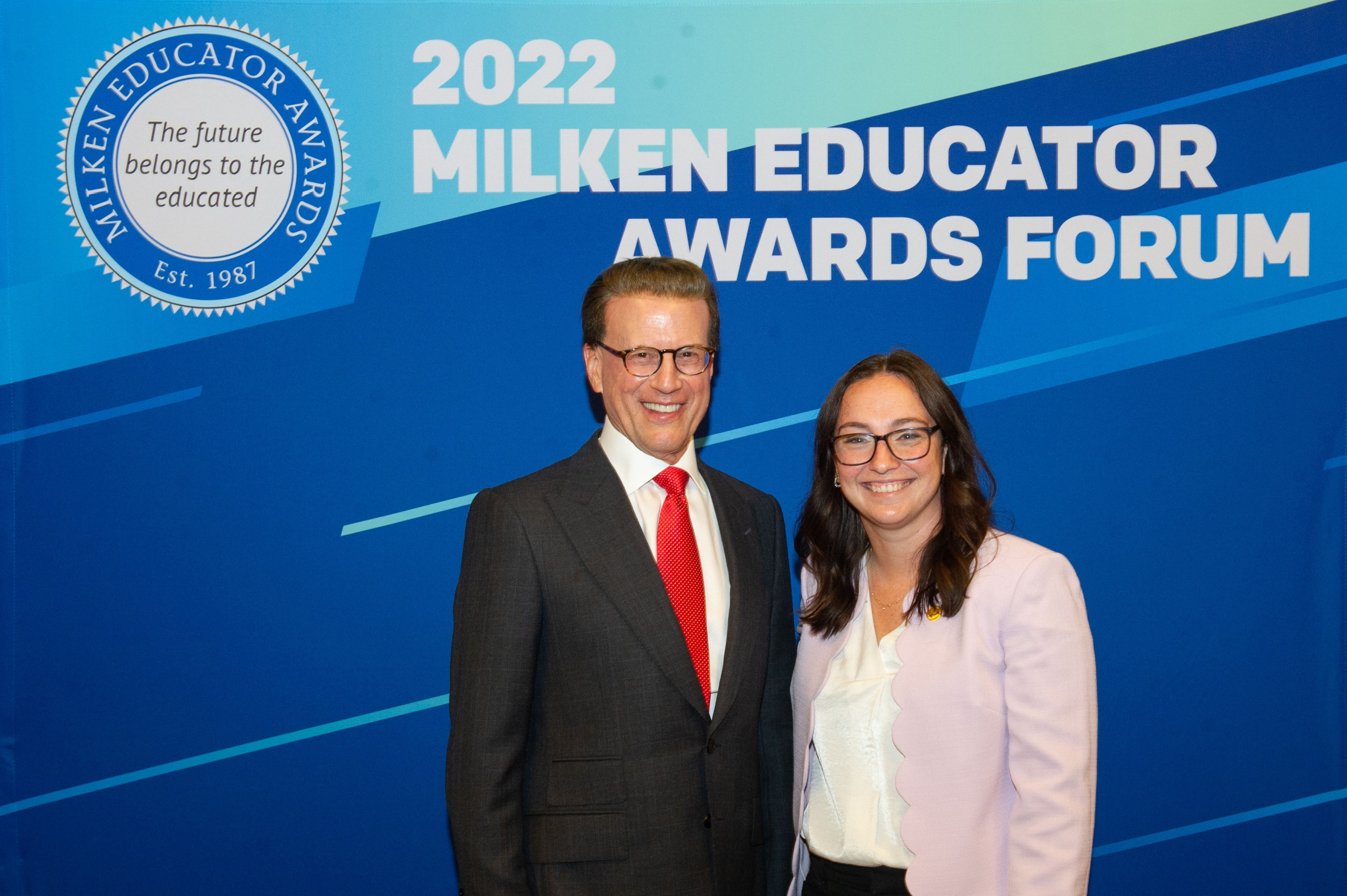Milken Educator Awards Founder Lowell Milken welcomes Carly Bowden (KS '19) to the 2022 Milken Educator Awards Forum.