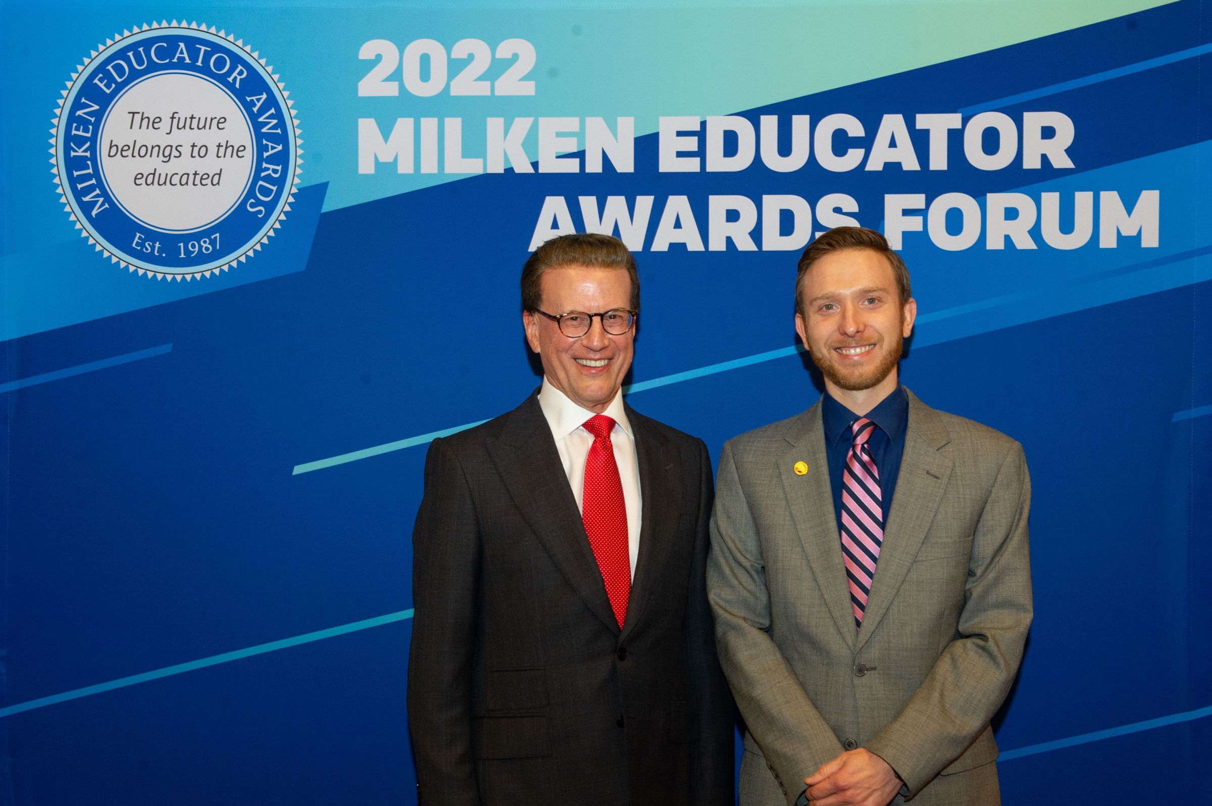 Milken Educator Awards Founder Lowell Milken welcomes Steven Gamache (LA '19) to the 2022 Milken Educator Awards Forum.