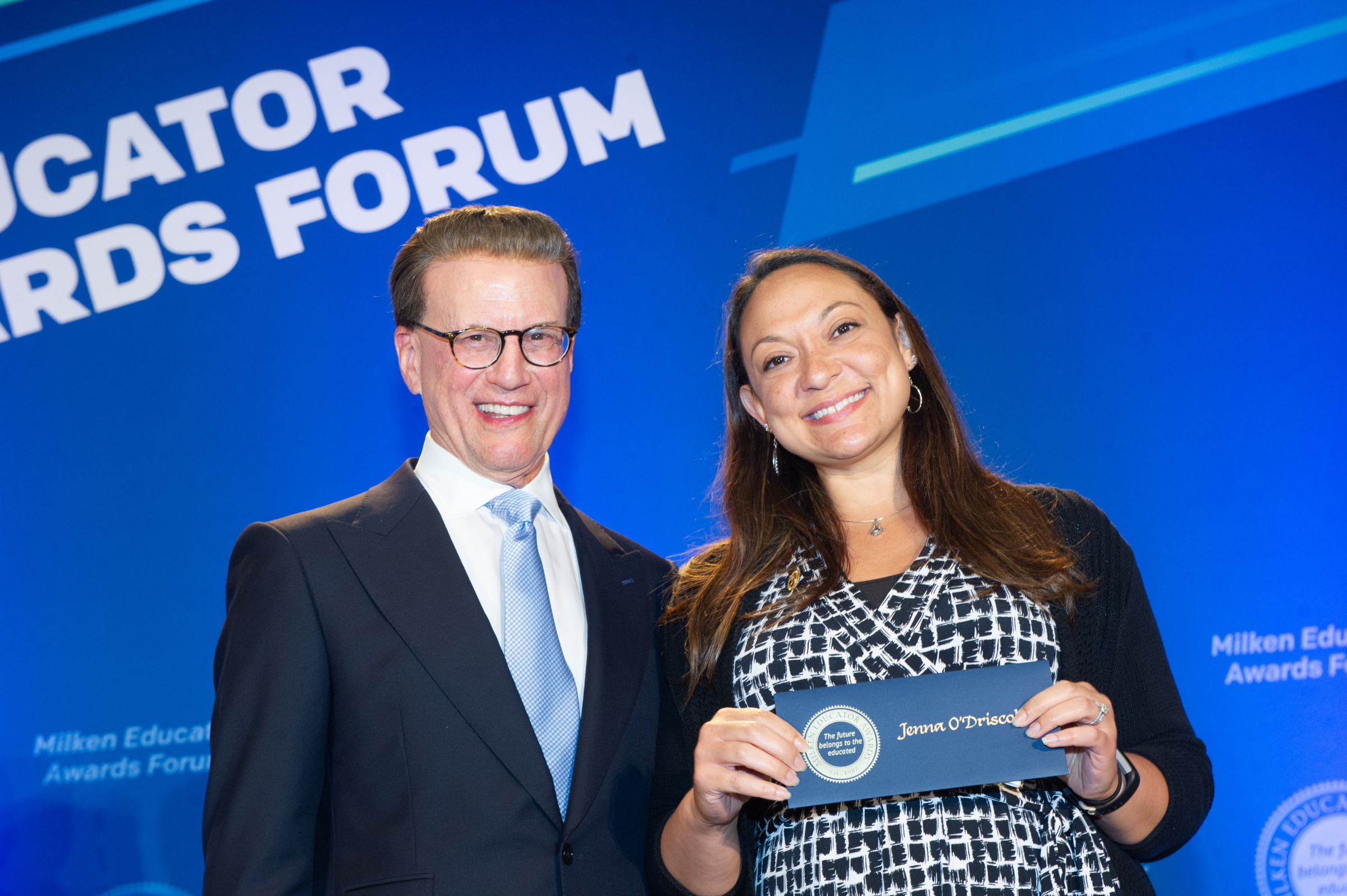Milken Educator Awards Founder Lowell Milken presents Jenna O'Driscoll (MI '21) with her $25,000 Milken Award prize.