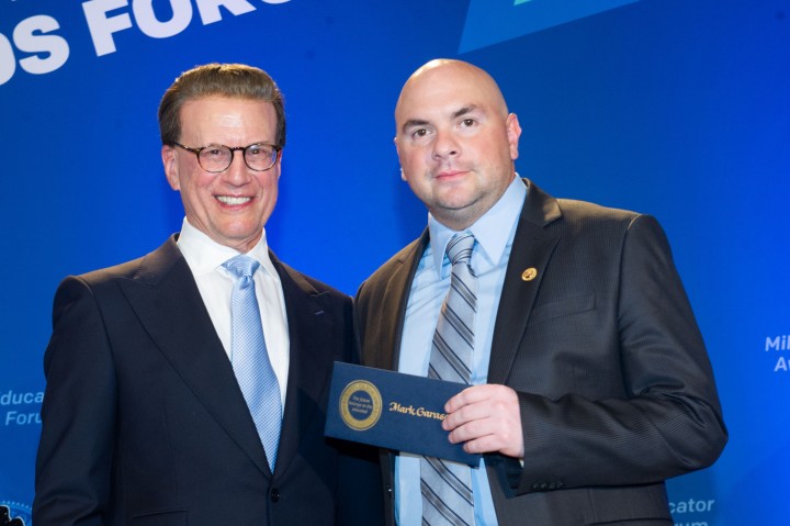Milken Educator Awards Founder Lowell Milken presents Mark Garascia (MO '21) with his $25,000 Milken Award prize.