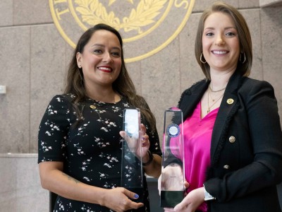 From left, Grant Harbison (AR '21); Kara Davis (AR '16); Amy Braswell (AR '02); Emily Howard (AR '22); Dawn McClain (AR '17); Jacob Oliva, Arkansas Secretary of Education; and Ouida Newton, chair of the Arkansas State Board of Education.