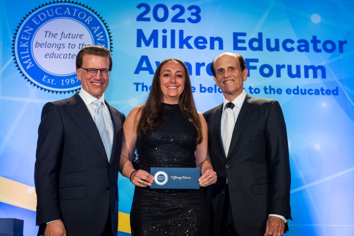 Tiffany Miera (CO '22) receives her $25,000 prize from Lowell Milken (left), Milken Educator Awards founder and Milken Family Foundation chairman and co-founder, and Mike Milken, president and co-founder of the Milken Family Foundation.
