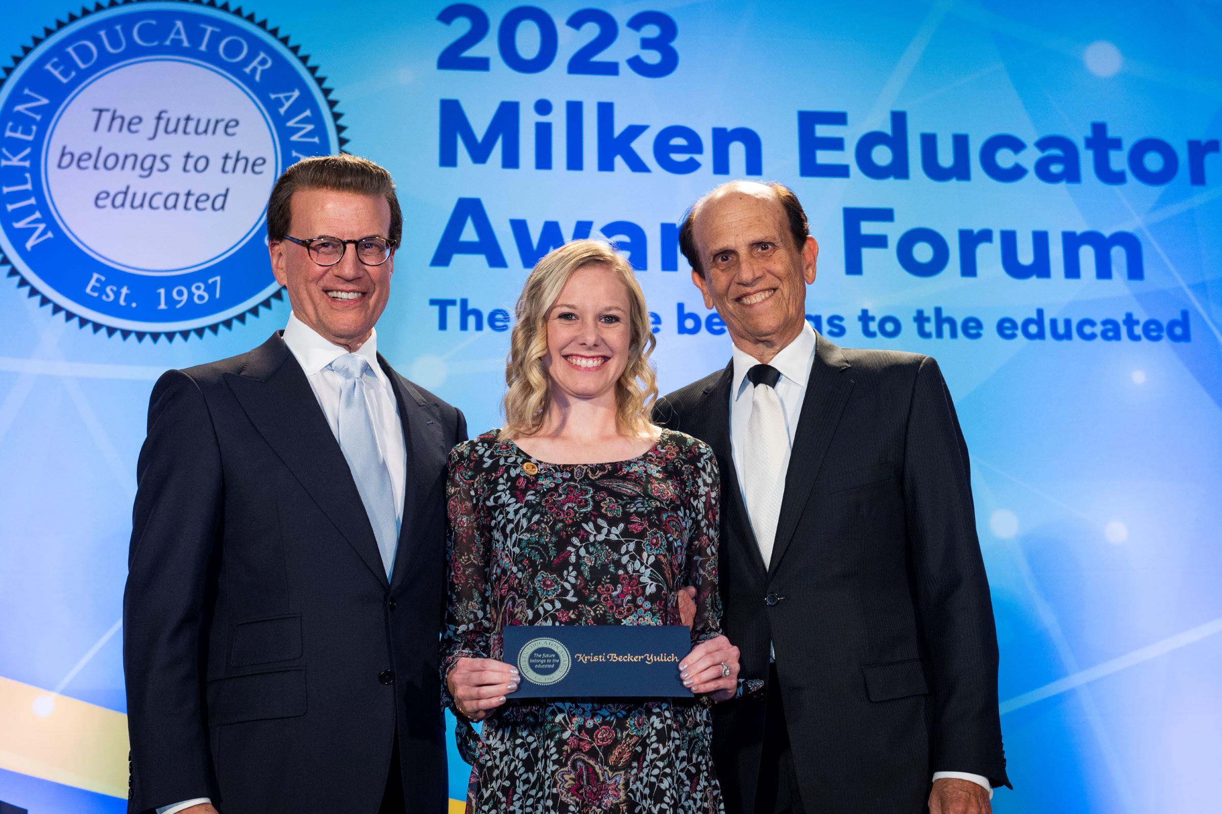 Kristi Becker Yulich (KS '22) receives her $25,000 prize from Lowell Milken (left), Milken Educator Awards founder and Milken Family Foundation chairman and co-founder, and Mike Milken, president and co-founder of the Milken Family Foundation.