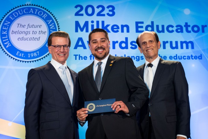 Christopher Nunez (NM '22) receives his $25,000 prize from Lowell Milken (left), Milken Educator Awards founder and Milken Family Foundation chairman and co-founder, and Mike Milken, president and co-founder of the Milken Family Foundation.