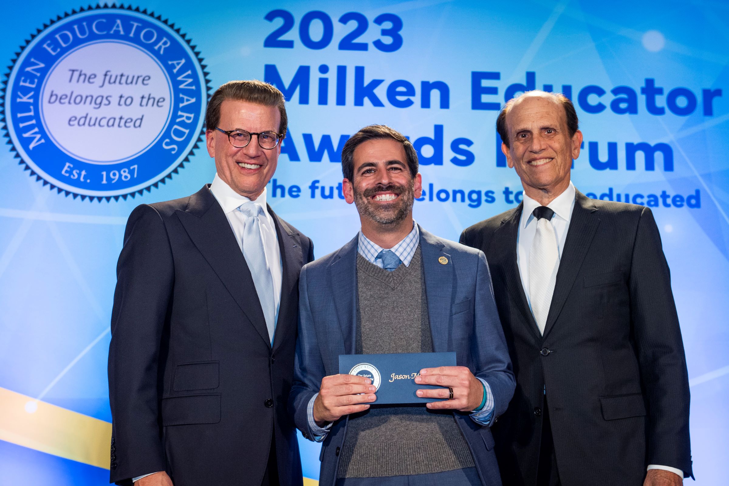 Jason Murray (NV '22) receives his $25,000 prize from Lowell Milken (left), Milken Educator Awards founder and Milken Family Foundation chairman and co-founder, and Mike Milken, president and co-founder of the Milken Family Foundation.