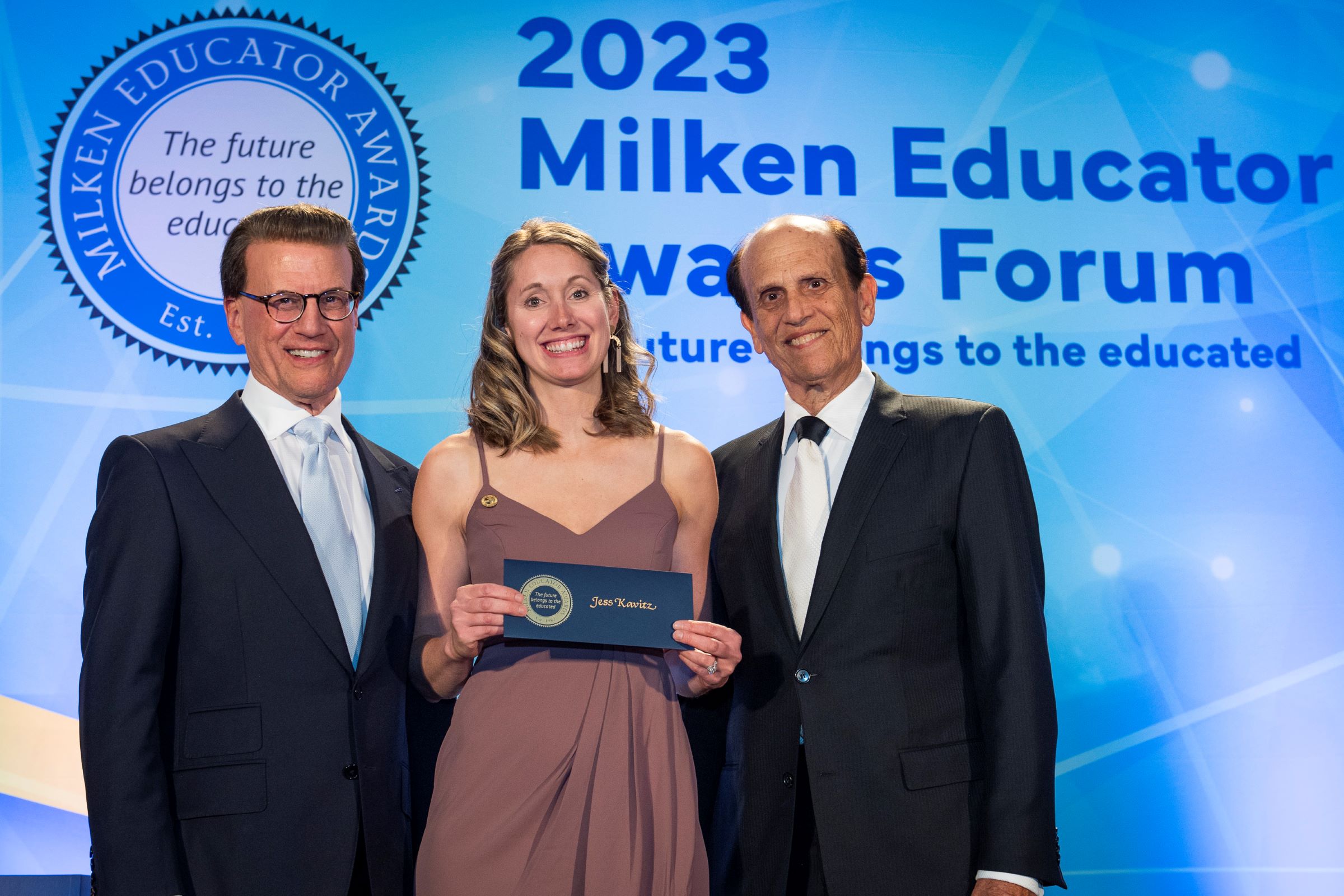 Jess Kavitz (WY '22) receives her $25,000 prize from Lowell Milken (left), Milken Educator Awards founder and Milken Family Foundation chairman and co-founder, and Mike Milken, president and co-founder of the Milken Family Foundation.
