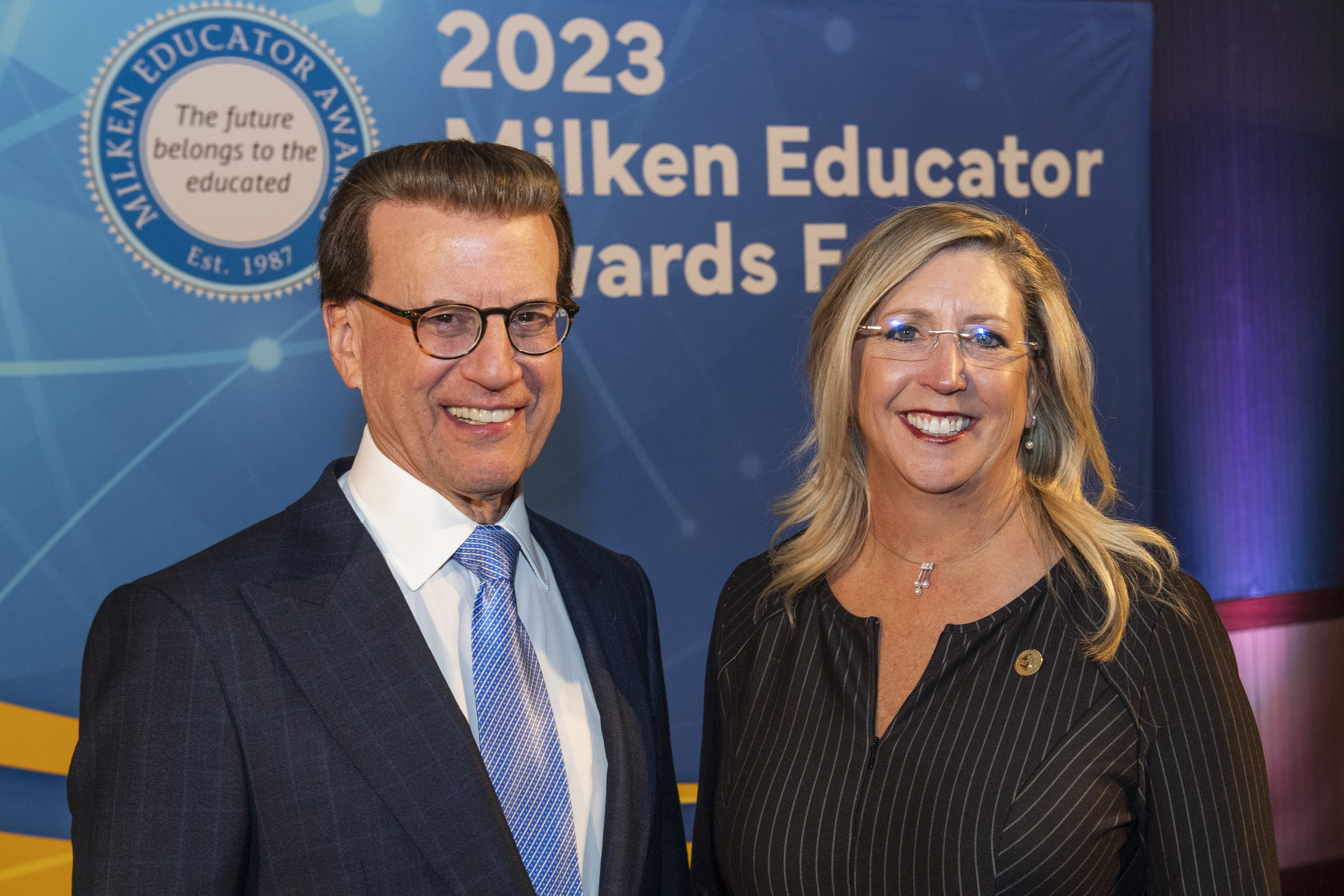 UCLA Luskin Conference Center | Los Angeles, CA | Apr 20, 2023Lowell Milken, founder of the Milken Educator Awards, greets veteran Milken Educator Dr. Angie Besendorfer (MO '96).
