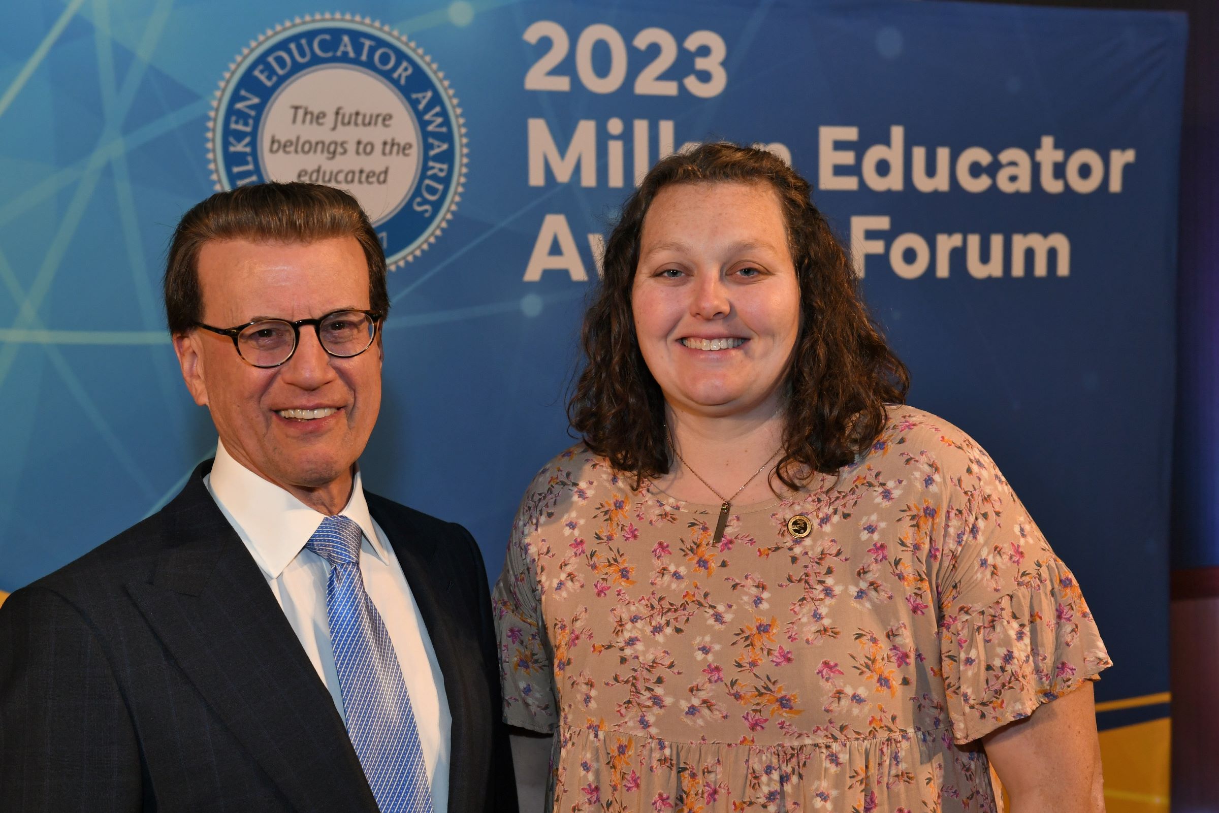 UCLA Luskin Conference Center | Los Angeles, CA | Apr 20, 2023Lowell Milken, founder of the Milken Educator Awards, greets veteran Milken Educator Kamisha Burlingame (AR '21).