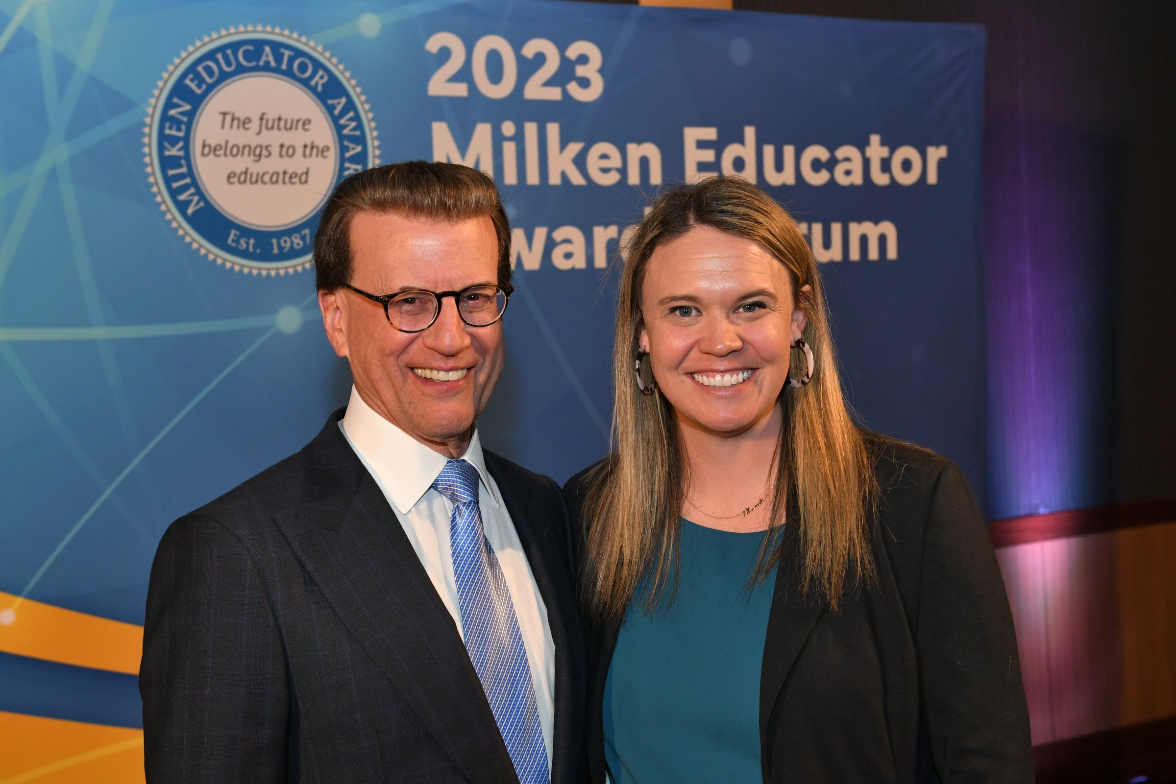 UCLA Luskin Conference Center | Los Angeles, CA | Apr 20, 2023Lowell Milken, founder of the Milken Educator Awards, greets veteran Milken Educator Kaitlin McPeake (AL '21).