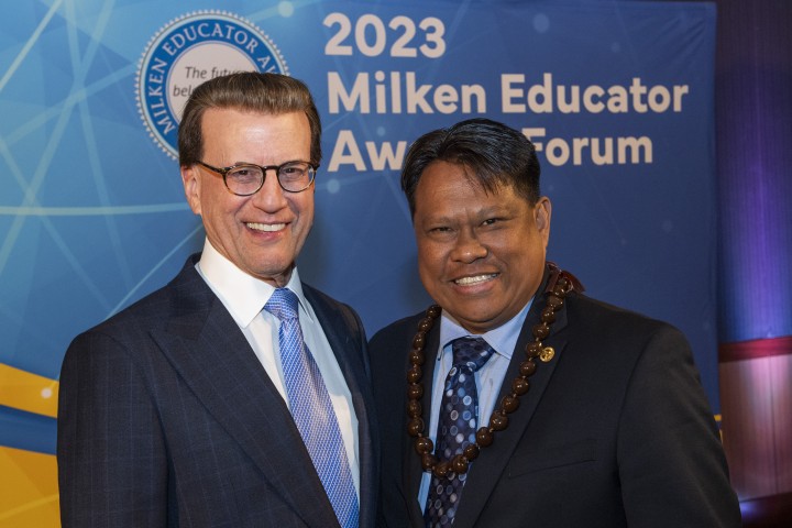 UCLA Luskin Conference Center | Los Angeles, CA | Apr 20, 2023Lowell Milken, founder of the Milken Educator Awards, greets veteran Milken Educator Mike Sana (HI '15).