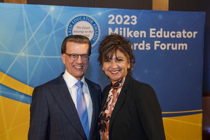 UCLA Luskin Conference Center | Los Angeles, CA | Apr 20, 2023Lowell Milken, founder of the Milken Educator Awards, greets veteran Milken Educator Dr. Rubylinda Zickafoose (FL '98).