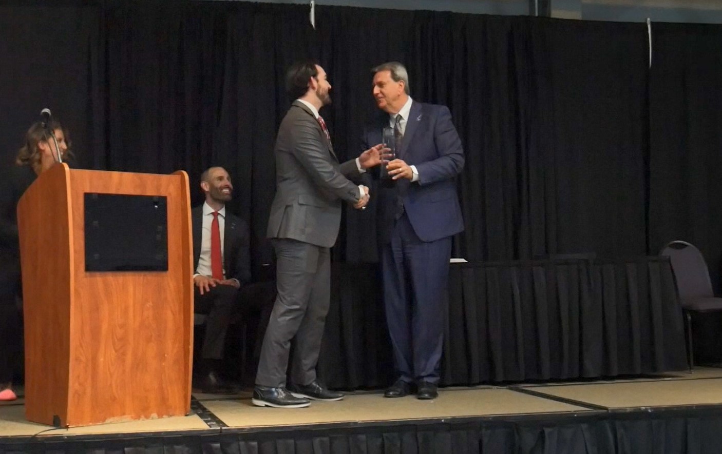 May 21, 2024Alex Lahasky (KS '23) receives his Milken Educator Award obelisk from Kansas Commissioner of Education Dr. Randy Watson during the Kansas Exemplary Educators Network (KEEN) State Education Conference in February 2024.