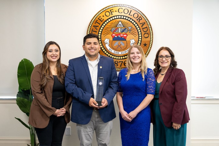 From left, Yvette Flores (Caleb’s wife), Caleb Flores, (CO ’23), Heidi Albin, (KS ’17), Colorado Commissioner of Education Susana Córdova.