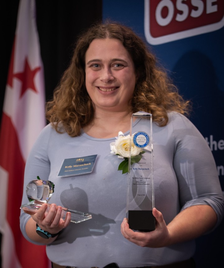May 21, 2024Kelly Maranchuck (DC '23) receives her Milken Educator Award obelisk during the 8th Annual Office of the State Superintendent of Education (OSSE) Educator Awards Ceremony on May 13, 2024.