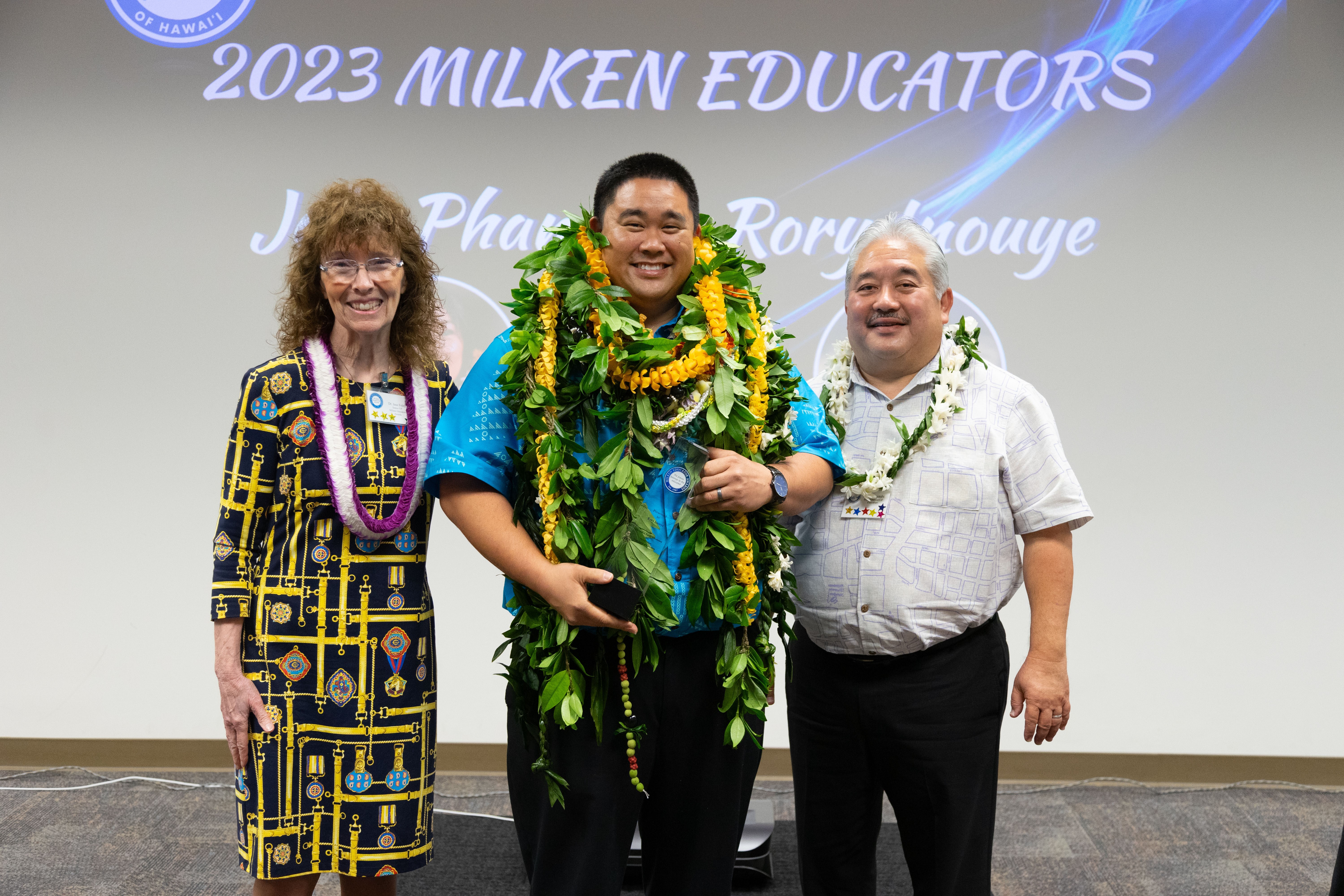 From left, Dr. Jane Foley (IN '94), senior vice president of the Milken Educator Awards; recipient Rory Inouye (HI '23); Hawai'i Superintendent of Education Keith Hayashi.