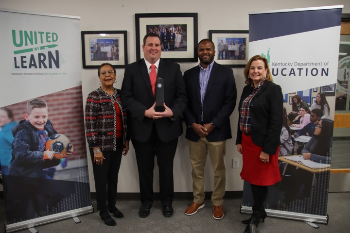 Pictured, from left, Kentucky Board of Education Chair Sharon Porter Robinson; recipient Jacob Ball; Carter G. Woodson Academy Assistant Principal Tommy Johnson; and Kentucky Interim Commissioner of Education Robin Fields Kinney.