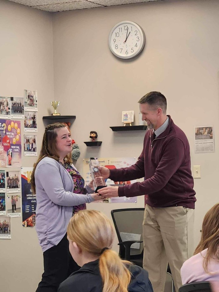 May 21, 2024Hancock County Technical Center Director Bill Tracy presents Meghan Stubbs (ME '23) with her Milken Educator Award obelisk on February 14, 2024.