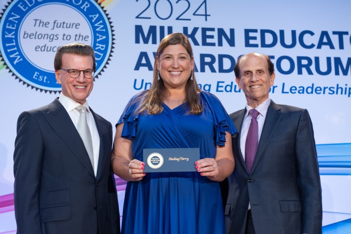 Shelley Terry (MA '23) receives her $25,000 prize from Lowell Milken (left), Milken Educator Awards founder and Milken Family Foundation chairman and co-founder, and Mike Milken, president and co-founder of the Milken Family Foundation.