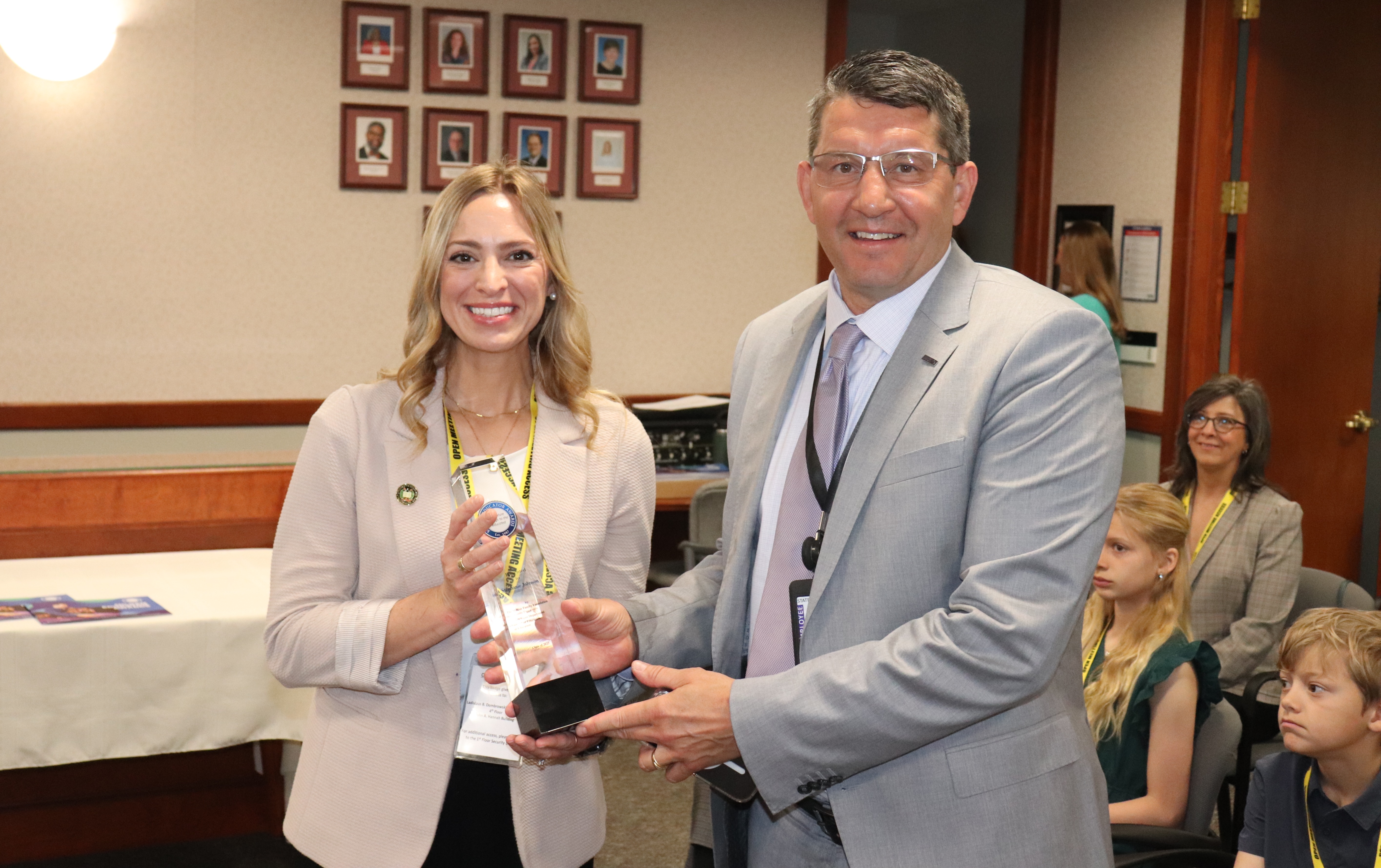 2025-2026Stephanie Johnson (MI '25) is presented with her Milken Educator Award obelisk at a State Board of Education meeting on April 14, 2026 in Lansing, Michigan.