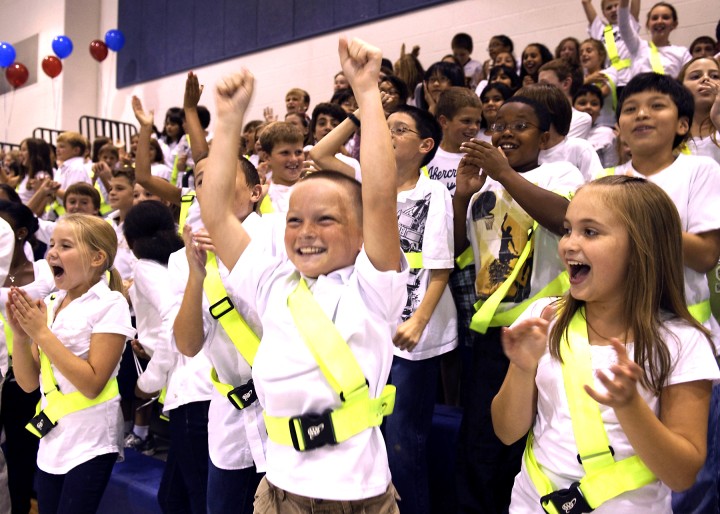 Belmont Station Elementary School | Ashburn, Virginia | Oct 07, 2010Students jump up to cheer for their teacher Sean Griffin.