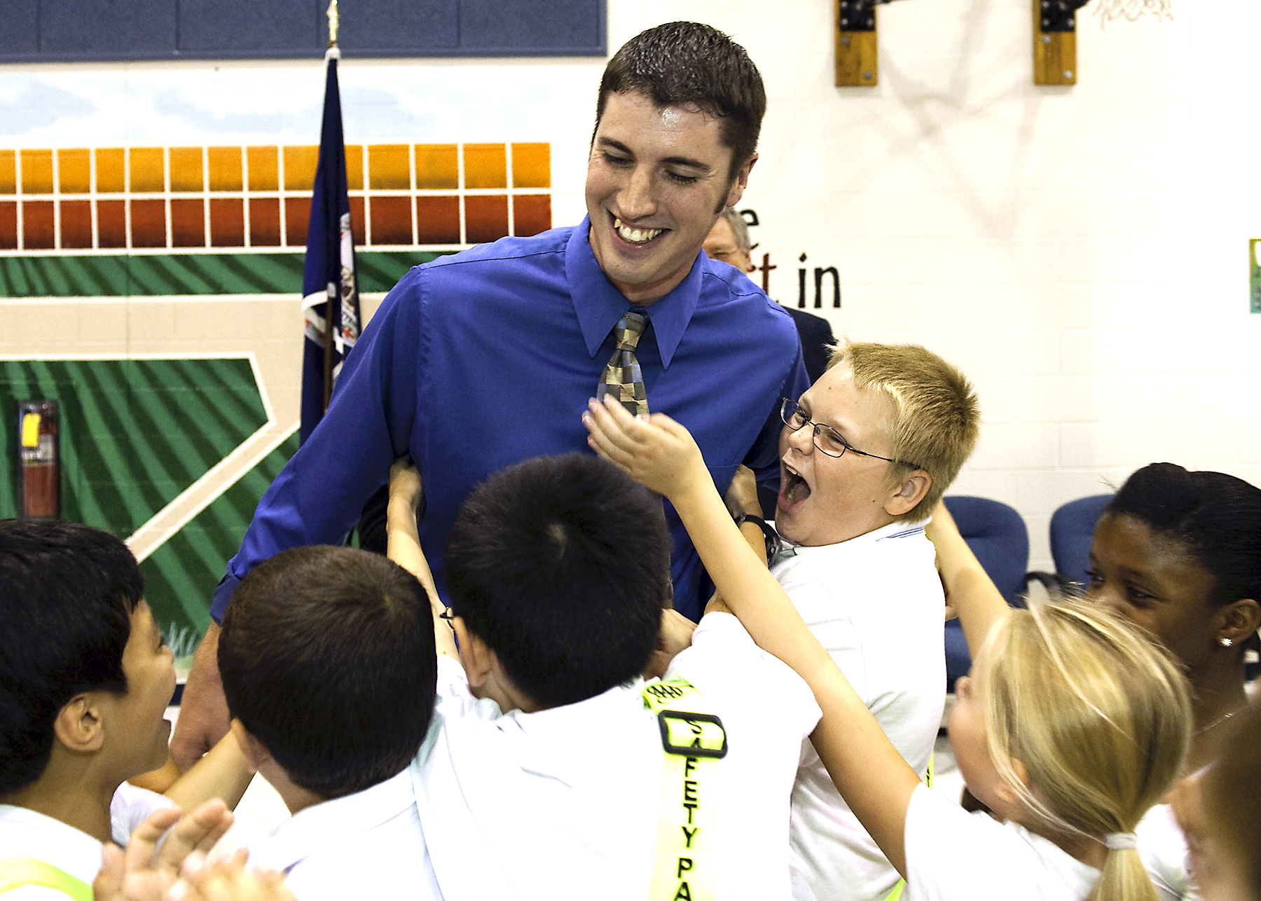 Belmont Station Elementary School | Ashburn, Virginia | Oct 07, 2010Griffin is affectionately clobbered by adoring elementary students congratulating him.