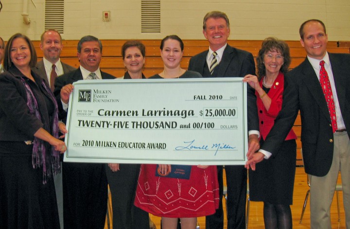 Melba Elementary School | Melba, Idaho | Oct 26, 2010Larrinaga stands with Milken educator Veterans and dignitaries who attended her Milken Educator Award Notification. From left to right: Cindy Wilson (ID '03), Rob Sauer (ID '05), State Superintendent of Public Instruction Tom Luna, Wife of State Superintendent Cindy Luna, Milken Educator Award Recipient Carmen Larrinaga, Governor Butch Otter, Milken Educator Awards Senior Vice President Dr. Jane Foley (IN '94) and Aaron McKinnon (ID '09).