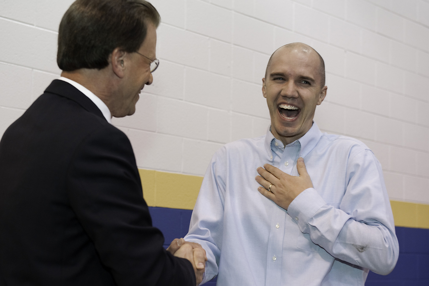 Stone Academy of Communication Arts | Greenville, South Carolina | Nov 01, 2010Still stunned from the news of his Milken Educator Award and mouth gaping, Brown shakes hands with Milken Family Foundation Chairman and Co-Founder Lowell Milken.