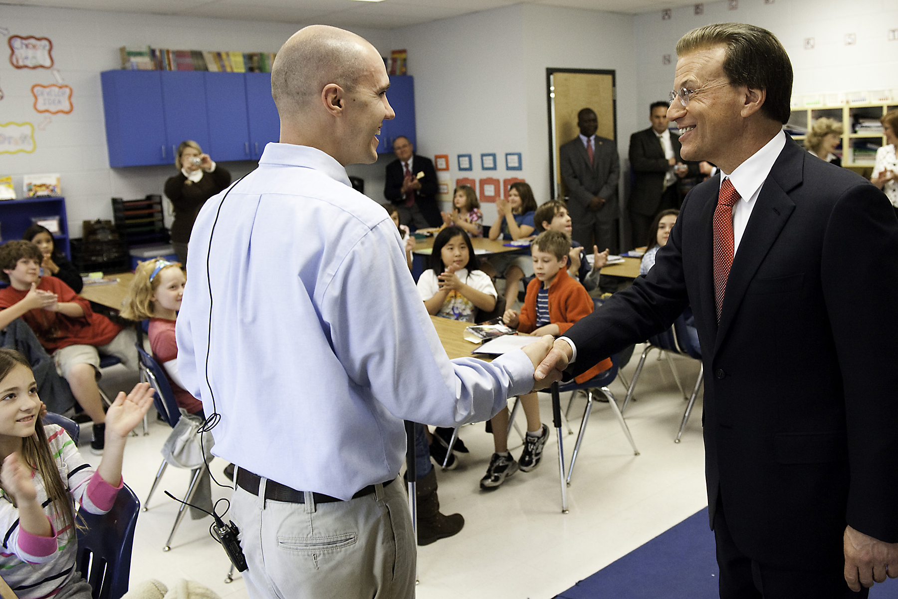 Stone Academy of Communication Arts | Greenville, South Carolina | Nov 01, 2010Students clap and cheer as Milken Family Foundation Chairman and Co-Founder Lowell Milken gives one final congratulatory handshake to Milken Educator Award Recipient Gresham Brown before bidding his class farewell. They are in very good hands under Brown's tutelage.