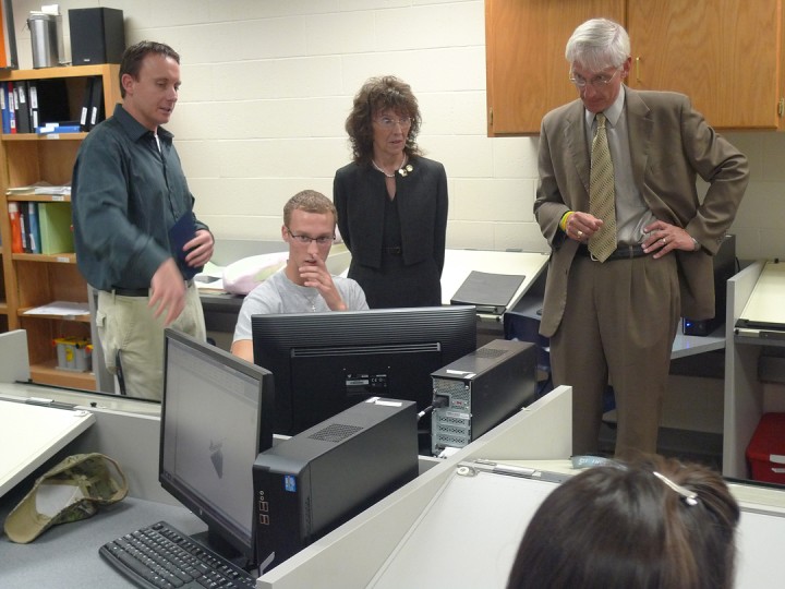 Kimberly High School | Kimberly, Wisconsin | Oct 11, 2011After receiving the 2011 Milken Educator Award, Kimberly High School technology teacher Kevin Janota shows his classroom to Milken Family Foundation Senior Vice President Dr. Jane Foley (IN '94) and Wisconsin State Superintendent of Public Instruction Dr. Tony Evers.