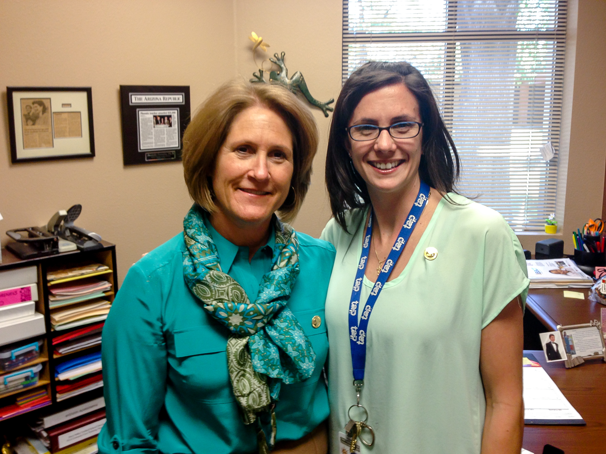 May, 2013Dr. Danielle Ferreira (AZ '12) (right) proudly showcases her new Milken Educator pin shortly after it was presented to her by veteran Milken Educator-cum-pinner Elie Gaines (AZ '04).