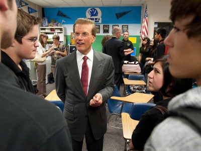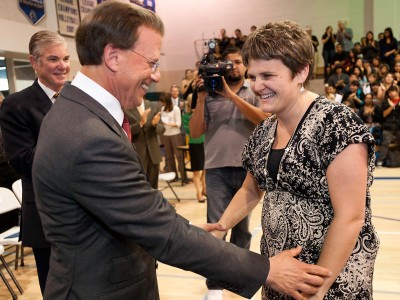 Cathedral City High School | Cathedral City, CA | January 31, 2012Welcome to the family, Carrie! Pictured are, from left, California Superintendent of Public Instruction Tom Torlakson, Milken Family Foundation Chairman and Co-Founder Lowell Milken, Dennis Jory (CA '93), Milken Family Foundation Senior Vice President Dr. Jane Foley (IN '94), Carrie Carnes (CA '11), Marisa Rivas (CA '09) and Jennifer Smith (CA '06).