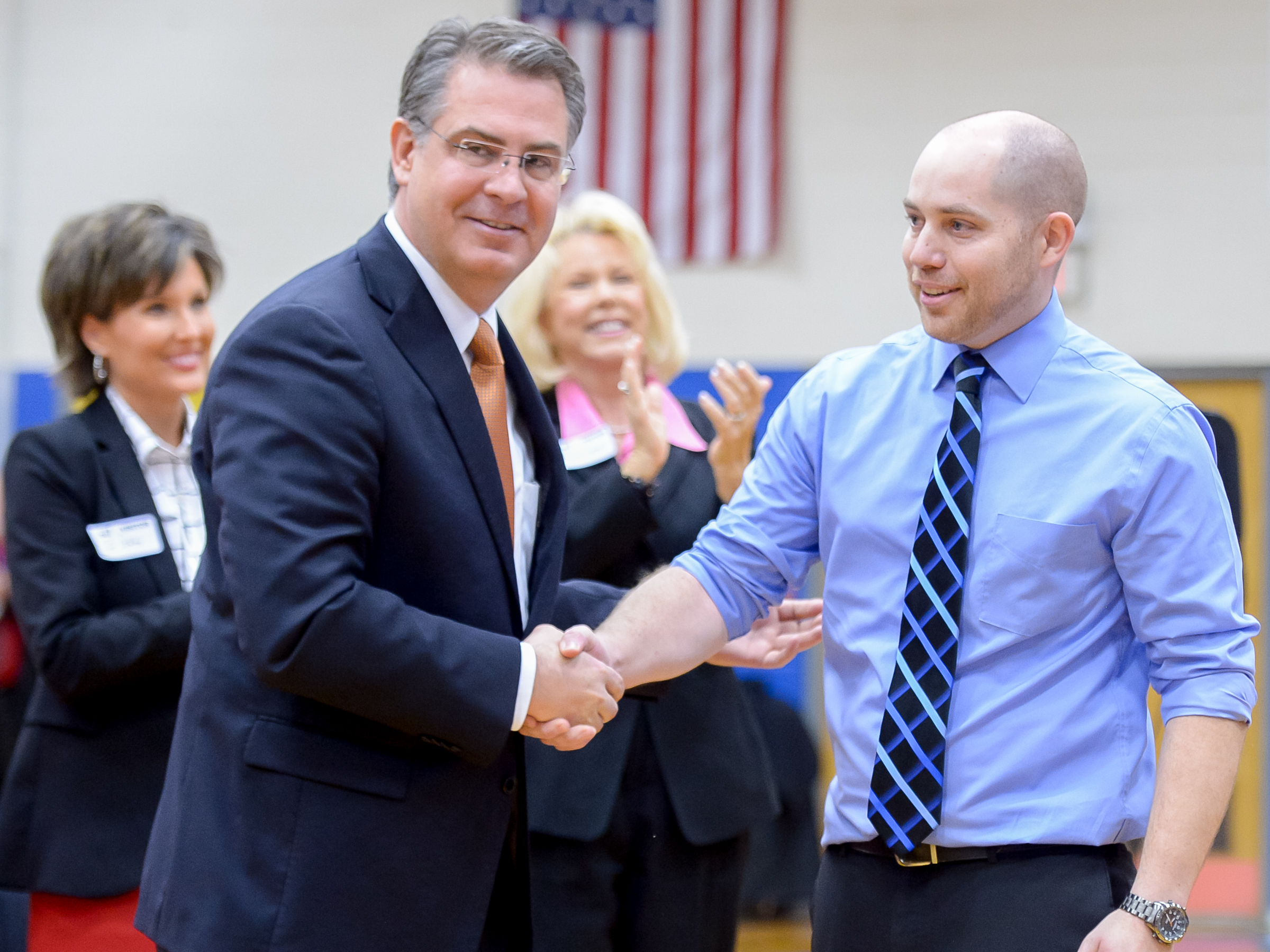 Athens City Middle School | Athens, TN | February 11, 2014On his way to accept his Award, Kevin shakes hands with President and CEO of the National Institute for Excellence in Teaching Dr. Gary Stark. It's both a congratulations and a “welcome” from one Milken Educator to another.